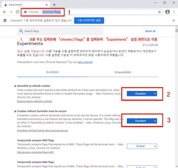 1. SameSite by default cookies 항목을 ( Disabled 체크하고 )